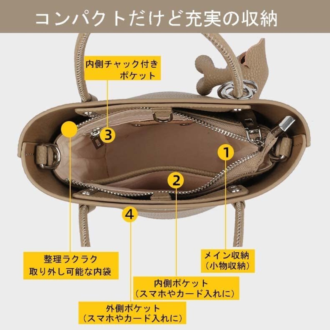取り外し可能な内袋でバッグの中の整理もラクラク♪