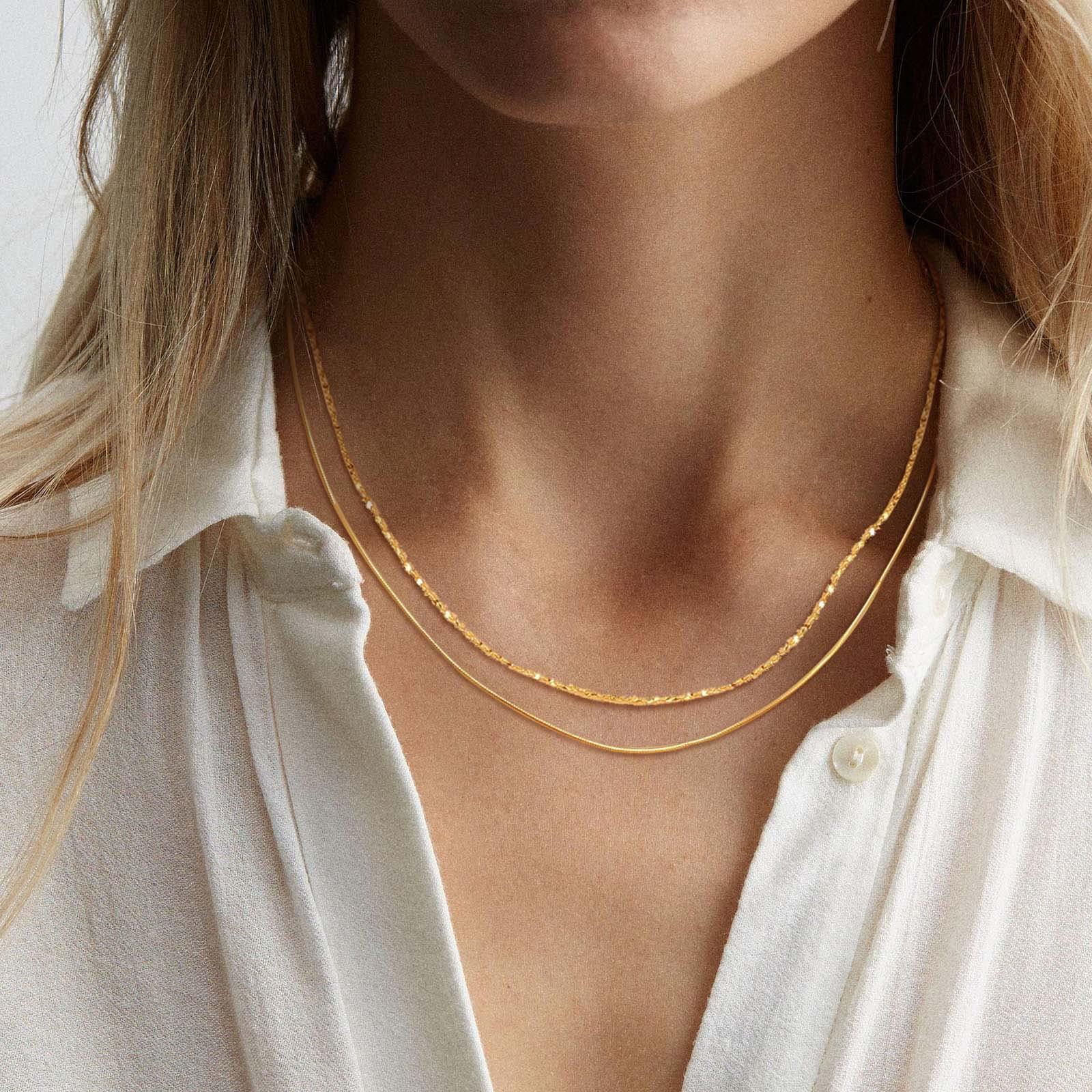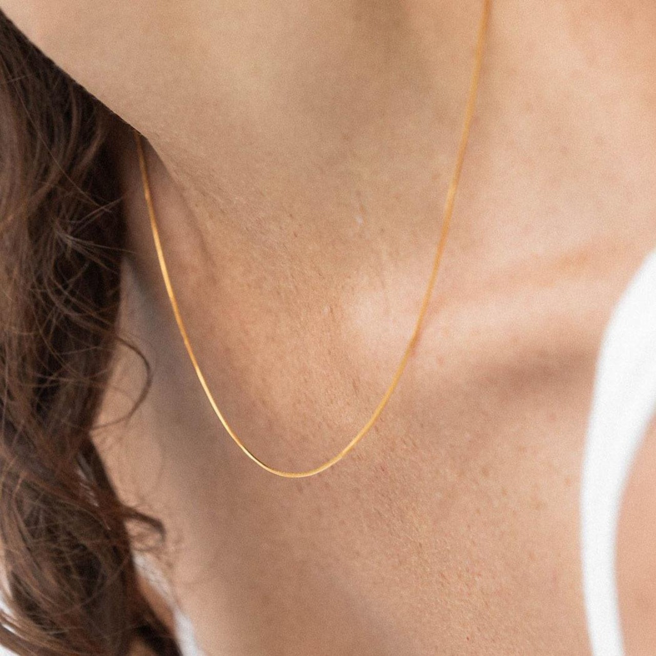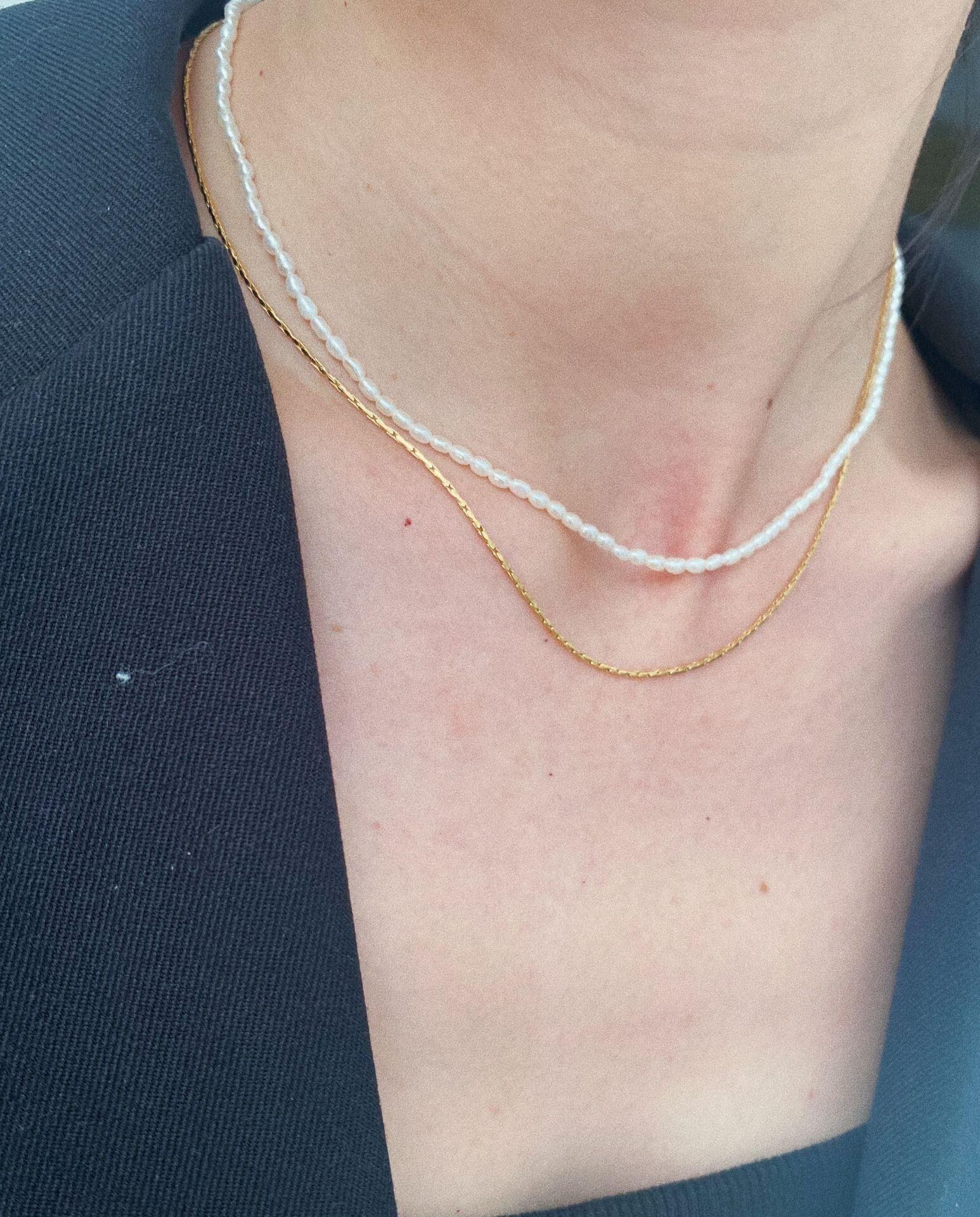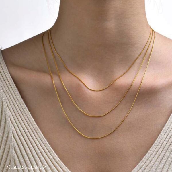 トレンドの極細スネークチェーンがコーディネートにこなれ感をプラス◎